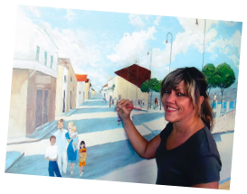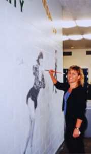 Right: The artist at work on the Dominick’s Pizza wall mural, Villa Park, IL 13’w x 5’h