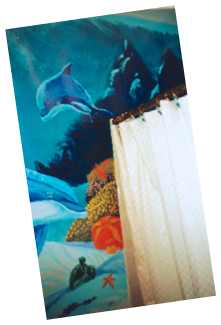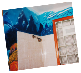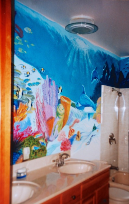 Above: A child’s bathroom, playful and colorful in its appeal can evoke the yearning for fun and adventure while growing and learning. The young daughter of a scuba diving enthusiast (which was my client) grew to become a well-educated, certified advanced open water diver herself. From this daily scene, it is no wonder she found subliminal and not-so-subliminal inspiration, unlimited imagination and the notion that “with education, study, responsibility and safety, no dream may ever go unfulfilled to the creative, determined, life seeker, thrill seeker and adventuring spirit”. Pool’s open!